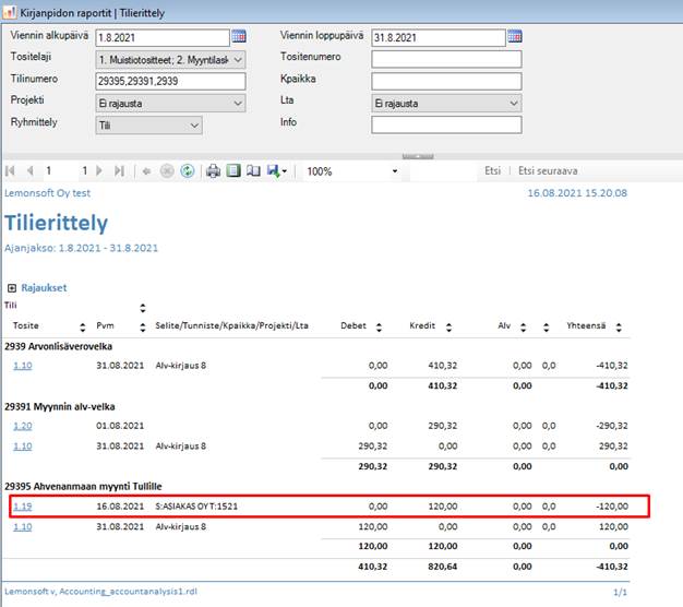 Tilierittely-raportin avulla näet tulille menevän osuuden. Voit rajata raporttia tilinumeroiden avulla.