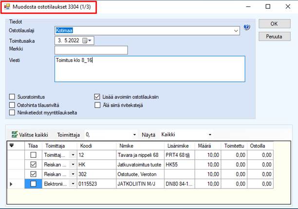Rivin toiminnot samoin kuin myyntitilauksella, mutta lisäksi toiminto Lisää tarvikkeet. Lue lisää hakusanalla Uusi huoltotyö.