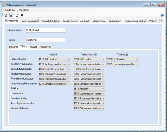 Tiliöintiryhmien avulla määrittelet sivukulujen pidätysprosentit ja määrittelet kuinka palkasta lasketut tiedot tiliöidään. Tiliöintiryhmille määrittelet myös keskituntiansioihin ja lomalaskentaan liittyviä kaavoja.