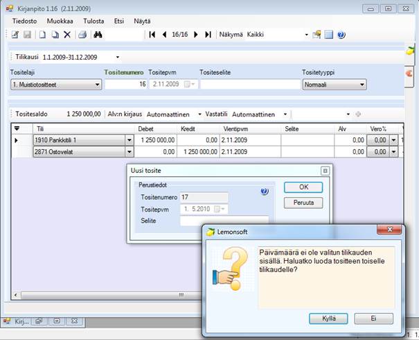 Siirry valitulle tilikaudelle tositteelle jonka haluat kopioida, valitse Uusi kopioiden, anna päivämäärä jolle haluat ko. tositteen kopioida. Ohjelma esittää kysymyksen joka huomauttaa, että päivämäärä ei ole valitun tilikaudella, halutaanko luoda tosite toiselle tilikaudelle. Vastaamalla kyllä luodaan uusi tosite.