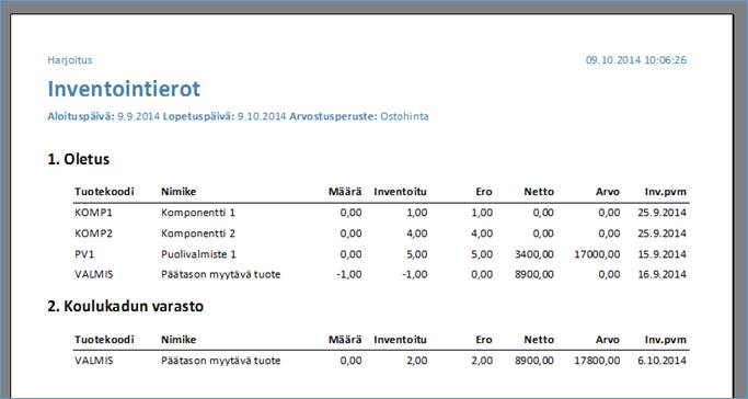 Raportti näyttää oletuksena kaikki varastot ja vain tuotteet, joiden inventoitu määrä eroaa varastosaldosta, joka oli ennen inventointia.