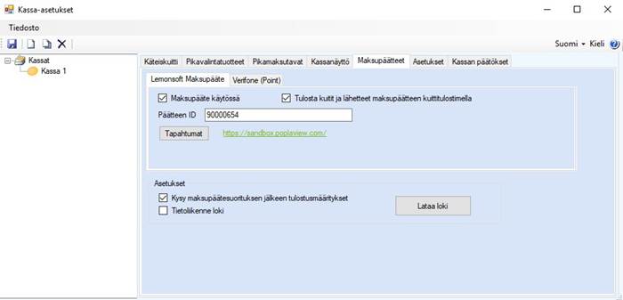 Maksupäätteet-välilehdellä voit määritellä Lemonsft Maksupääte -asetukset. Lue lisää ohjeesta Lemonsoft Maksupääte.