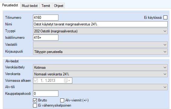 Perusta marginaaliverollinen myynti- ja ostotili alla olevan esimerkin mukaisesti. Nämä tilit ovat aina bruttotilejä. Lisää laskutusta varten marginaaliveromyyntitilille lakipykälä, joka näkyy laskulomakkeen rivitiedoissa.