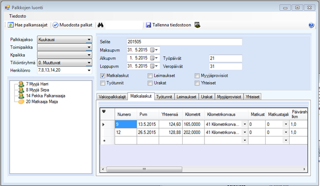 Palkkojen luonti -toiminnossa voit valita Matkalaskut mukaan luotaviin palkkatapahtumiin. Henkilön tuotavat matkalaskut näet Matkalaskut –välilehdellä.
