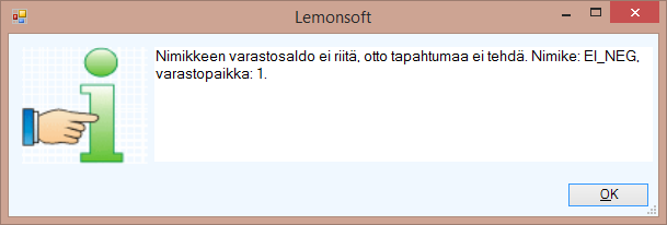 Mikäli jollekin myyntitilauksella olevista nimikkeistä on määritelty negatiivisen varastosaldon esto Nimikerekisterin Muut tiedot -välilehdelle ja tilauksen toimittaminen veisi saldon miinukselle, ei tilausta voi toimittaa..