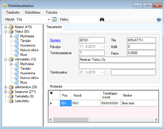 keskeneräiset ostotilaukset keskitetysti tilajärjestyksessä.
