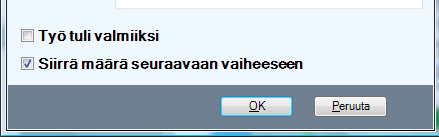 Kun kirjaat vaiheen valmiiksi, niin voit siirtää seuraavaan työvaiheeseen valmistuneen määrän. Ohjelma jakaa seuraavan työvaiheen muodostamalla työvaiheesta uuden työvaiheen. Uuden työvaiheen määräksi tulee nykyisessä vaiheessa valmistunut määrä ja alkuperäisestä vaiheesta vähennetään vastaava määrä.