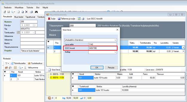 Kun suoritat myyntitilauksen keräilyn, valitse Uusi lava -toiminnossa kuljetusyksiköksi Transbox-laatikko ja aseta laatikon numero SSCC-koodi-kenttään.