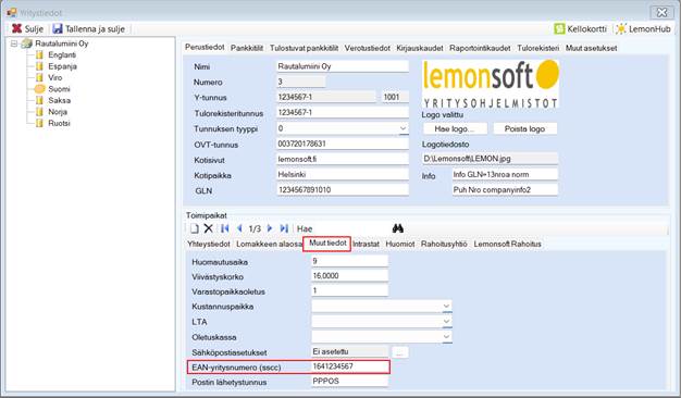 o Lisäksi tarkista, että Asetukset | Yritystiedot-näytön Muut tiedot -välilehden EAN-yritysnumero (sscc) -kentästä löytyy arvo, jonka saat GS1 Finlandista.