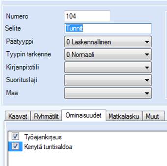 Määritellään haluamallesi palkkalajille ominaisuudet – työajankirjaus ja kerrytä tuntisaldoa. Mikäli tietoja vietäisiin palkanlaskentaan, kannattaisi palkkalaji perustaa isommalla numerolla, jotta voi rajata sen toimintokeskuksen asetuksella pois palkkojen luonnista.