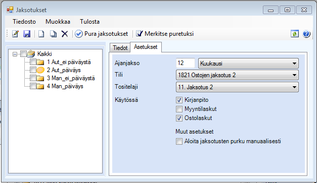 Kun jaksotukset halutaan purkaa, ei annetulla aikavälillä ole merkitystä, sillä oletuksena puretaan kuluksi vain niille kuukausille, jotka ovat 1.10 jälkeen (annettuun loppupäivämäärään saakka).