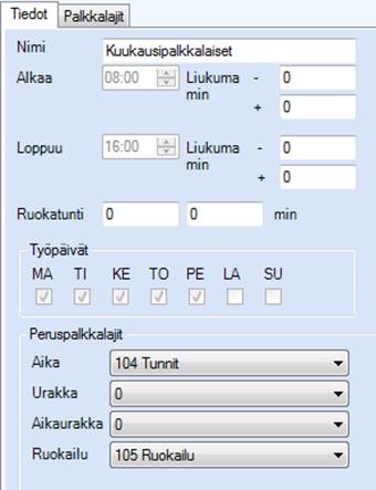 Työvuorolle määritellään normaali työaika. Ruokatunti (30 minuuttia) sisältyy työaikaan, joten tätä ei merkitä työvuorolle. Määrittele aika- ja ruokailupalkkalajit.  Määrittele näille palkkalajeille ominaisuudeksi kerrytä tuntisaldoa.