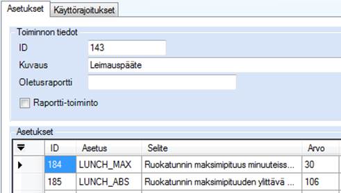 Määrittele myös palkkalajinumero (LUNCH_ABS), jolle ylimenevä poissaolo kirjataan. Palkkalaji ei kerrytä tuntisaldoa.