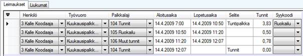 Henkilö lähtee ruokailuun klo 10:50 ja palaa klo 12:07, jolloin ensimmäiset 30 minuuttia kirjautuvat normaaliksi ruokailuksi ja ylimenevä osa sisäänkirjautumishetkeen asti määritellylle poissaolopalkkalajille.