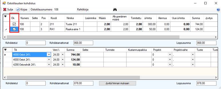 Voit myös kohdistaa ostolaskun ostotilaukseen kohdistamatta rivejä. Valitse silloin näytön yläosan riveille Ok-valinta aktiiviseksi. Huomaa, että mikäli et tee kohdistuksia riveittäin, et voi jyvittää mahdollisia rahtikuluja kohdistuksessa. Tämä siksi, että ohjelma jyvittää kaikki kohdistamattomat rivit hinnan mukaan kuluksi ostotilaukselle.