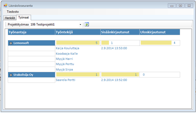 Henkilöstöhallinto Läsnäoloseuranta Työmaat-välilehdellä näet raportin avulla valitsemasi työmaan sisään- ja uloskirjautuneet työntekijät työnantajittain.