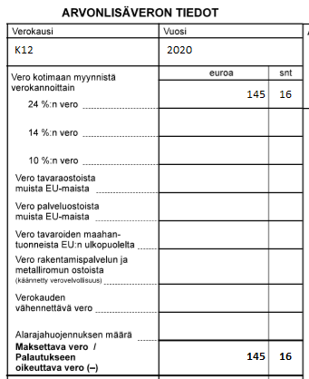 Myynnistä suoritettava arvonlisävero on 24/100*604,84= 145,16€