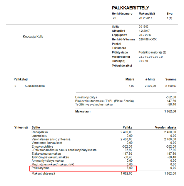 Esimerkki 1: Alla näet esimerkin siitä, miten voit määritellä palkkaryhmän tulostettavaksi palkkaerittelylle apuluvun avulla.