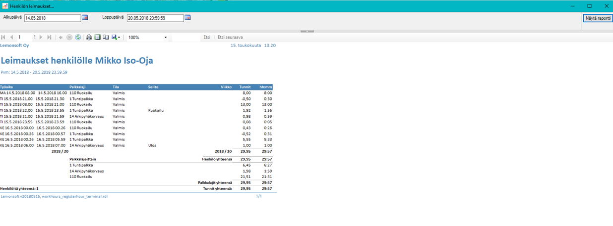 Henkilön leimaustapahtumat tulostuvat esikatseluun ajanjaksolta, joka on Toimintokeskus | Leimauspääte | PRINT_PERIOD asetuksen arvoksi annettu.