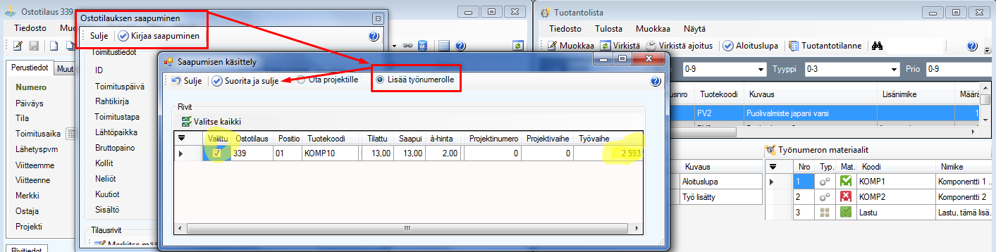 Kun saavutat Ostotilauksen saapuminen -näytössä ostotilauksen Kirjaa saapuminen -toiminnolla, ohjelma avaa Saapumisen käsittely -näytön, jossa voit valita rivit (Valittu-rasti) ja Lisää työnumerolle -valinnalla ja Suorita ja sulje -toiminnolla ohjelma kohdistaa osat työnumeron rakenteeseen.