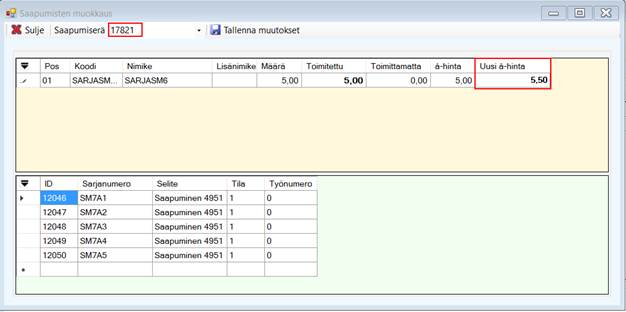 Kuva: Saapumiserä 17821 valittu muokattavaksi ja Uusi á-hinta kenttään syötetty uudeksi hinnaksi 5,50.
