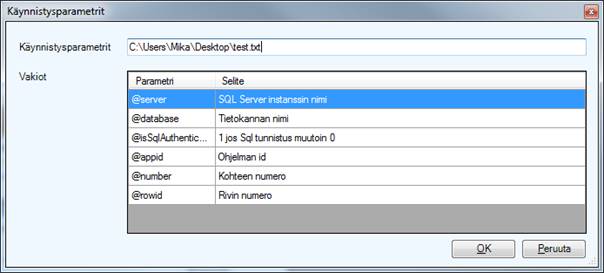 Esim. alla olevassa kuvassa oleva määritys /server:@server /database:@database voisi ajonaikana näyttää tältä:  /server:myServer\SqlExpress /database:LemonDB0