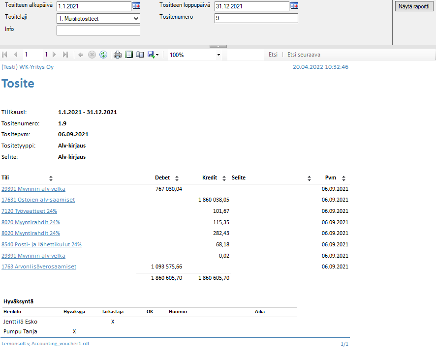 Suoraan Kirjanpito-toiminnosta tulostettuna raportti esittää tulostettavaksi näkyvissä olevan tositteen. Kirjanpidon raportit -toiminnon kautta tulostettuna oletusrajaus haetaan yritystietoihin määritellyn raportointikauden mukaan.