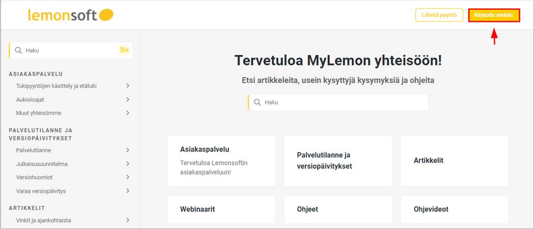 Ennen tukipyynnön kirjaamista valitse MyLemon-yhteisön etusivun artikkeleista Usein kysytyt kysymykset (FAQ), ohjeet ja videot ja tarkista löytyykö ongalmaasi ratkaisu jo tätä kautta.