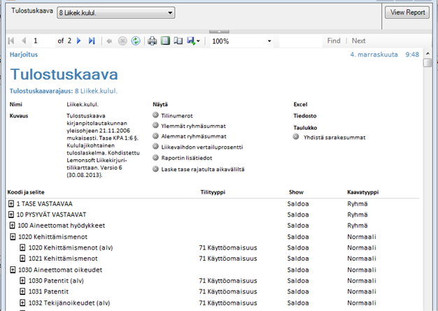 Raportin avulla voit tulostaa yksittäisen tulostuskaavan ja kyseisen tulostuskaavan kohdat. Voit hyödyntää raporttia esimerkiksi, kun haluat tarkistaa onko kaava kohdistettu oikein käyttämääsi tilikarttaan.