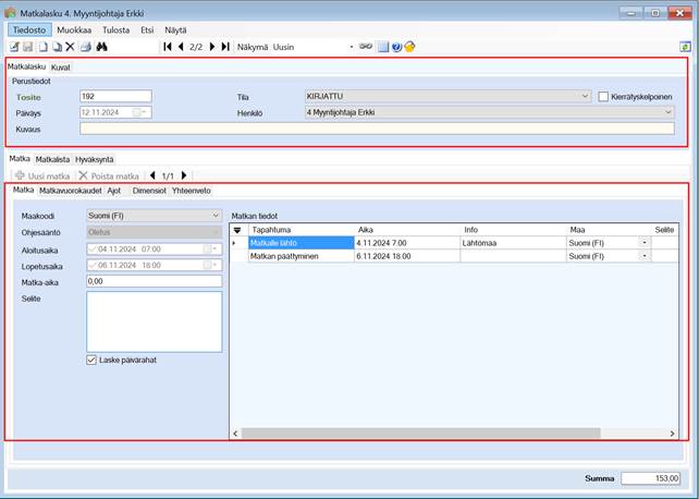Kuva: Matkalaskun Yhteenveto-välilehti