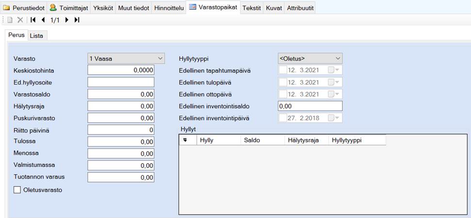 Nimikkeellä on aina oltava vähintään yksi hylly, oli se siten nimellinen tai ilman nimeä (tyhjä) oleva hylly. Ohjelma laskee varastosaldon aina hyllyistä, riippumatta siitä ovatko hyllyt käytössä vai ei.