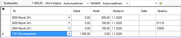 Esimerkissä alla bruttomyyntitilille kirjattu 1000 euroa.