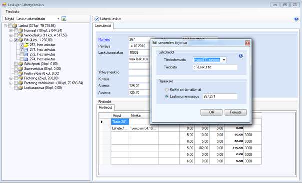 EDI laskut muodostetaan Laskujen lähetyskeskuksesta. Valitaan tiedostomuoto sekä tiedostopolku mihin edi laskuaineisto kirjoitetaan. Oletuksena rajauksena on laskujen lähetyskeskuksessa valitut laskut.