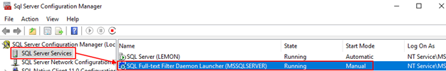 Jos olet SQL Server -tietokantojen ylläpitäjä, voit tarkastaa Sql Server Configuration Manager –sovelluksesta, onko SQL Full-text Filter Daemon Launcher (instanssin nimi) –palvelu asennettuna ja käynnissä (valitse käynnistystavaksi Automatic).