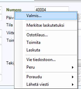 Voit kirjata huoltotyön valmiiksi joko huoltotilauskeskuksesta tai suoraan huoltotilaukselta valitsemalla tilannekohtaisesta valikosta Valmis-toiminnon.