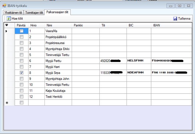 Palkansaajien tilit –välilehdellä voit muuttaa/korjata palkansaajien tilinumeroita. Työkalu myös ehdottaa automaattisesti päivitettäväksi tilinumerot, joissa on havaittu virheitä/puutteita ja samalla korjaa ne.