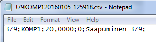 Muodostuvan csv tiedoston esimerkkisisältö ostotilauksen 379 saapumiskirjauksesta jossa Komp1-tuotetta saapuu 20 kpl.