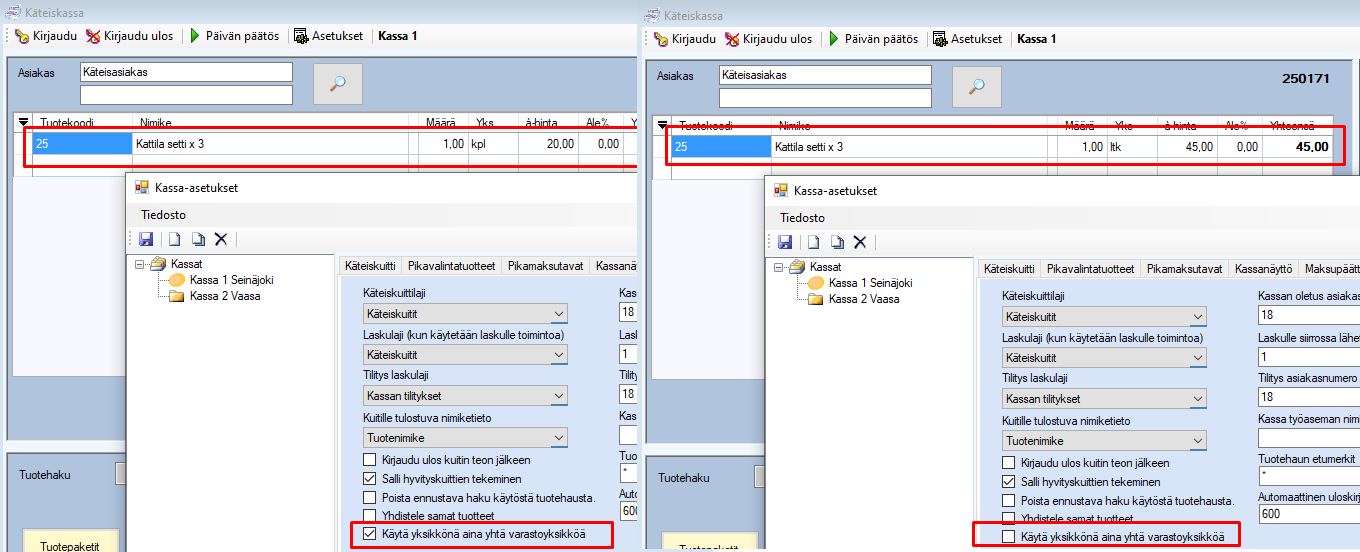 Käytä yksikkönä aina yhtä varastoyksikköä – asetuksella voit määritellä haluatko ohjelman tuovan tuotteen kassan näytölle, yksikkönä toimii aina yksi varastoyksikkö.
