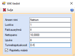 -Lipuke: aineen kuljetuksessa käytettävän lipukkeen numero -Tunnelirajoituskoodi: Kuljetuskategoria (tunnelirajoituskoodi) -Rajoitettu määrä: ominaisuuden rastittamalla ohjelma