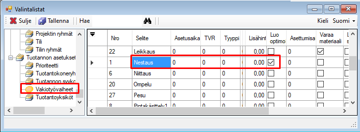 1. Lisää Valintalistat Tuotannon asetukset Vakiotyövaiheet-listaan vakiotyövaihe ja lisää sille Luo optimointitiedosto-valinta. Ohjelma muodostaa esimerkiksi työvaiheen aloituksen yhteydessä optimointitiedoston tältä vaiheelta.