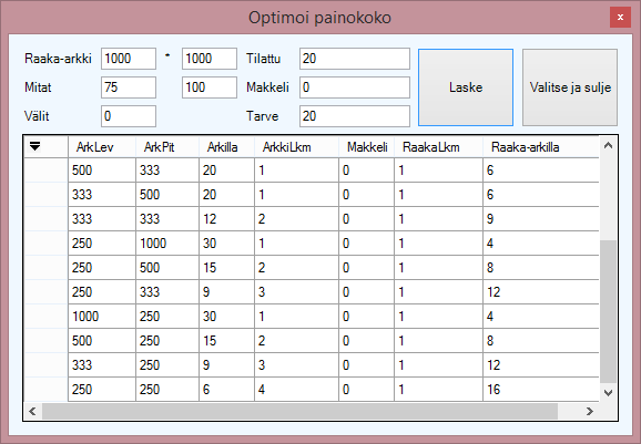 6.) Painokoon optimointi -ikkunassa voit täydentää kenttiä ja laskettaa aina valintojen mukaisesti optimoidun painokoon arkkilukumäärineen. Vasta Valitse ja sulje -valinta tallentaa optimoinnin.