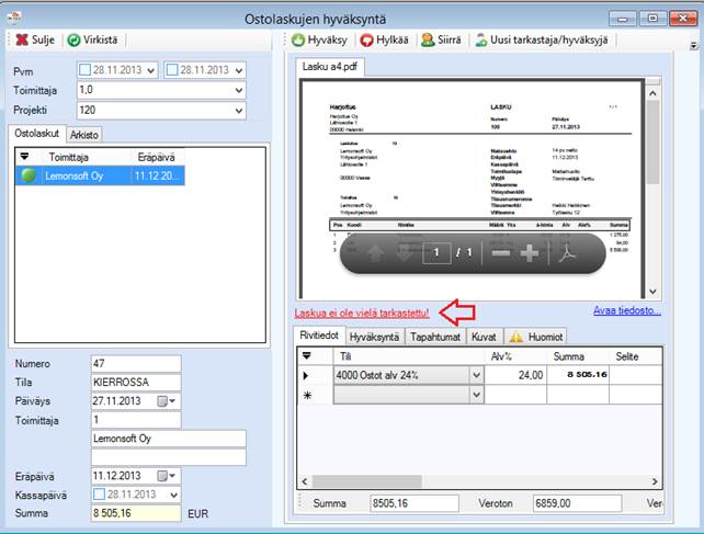 Muut ostolaskuun liittyvät ohjelman tekemät tarkistushuomiot näytetään ostolaskun kuvan alla alleviivattuna tekstinä.