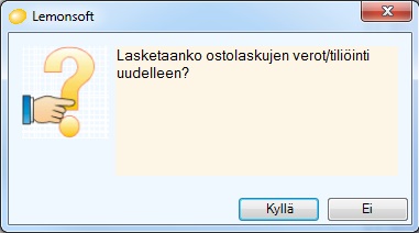 Tiliöi ja laske verot uudelleen -toiminnon avulla saat tehtyä ostolaskujen uudelleen tiliöinnin tilikartan mukaisten tilien verokannoin.