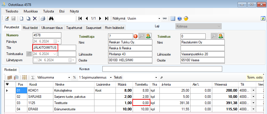Kuva: Edellisessä kuvassa tehdyn poiston ja tallennuksen jälkeen, ohjelma päivitti Pos 03 tilausrivin Toimitettu-määräksi 0 ja tilauksen tilaksi Jälkitoimitus. Samalla ohjelma vähensi 1kpl tuotteen 1125 varasto- ja hyllysaldosta, päivitti nimikkeen keskiostohinnan, poisti saapumiserän ja sen varastotapahtuman.