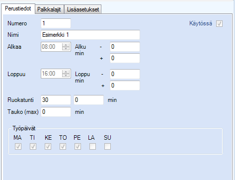 Työvuoron oletusasetuksilla työtunnit menevät aikapalkkalajille (1 Tuntipalkka). Mikäli tunteja kertyy yli kahdeksan ja henkilö kirjautuu leimauspäätteeltä ulos Ylityö-syykoodilla, tutkii ohjelma tuntirajat ja pilkkoo leimauksen automaattisesti normaaliin tuntipalkkaan sekä ylityön perusosiin. Perusosille voit määritellä palkkojen luontia varten lisien ketjutukset. Huomaa että tuntimääritys on aina työtuntitarpeen mukaan, eli esim. jos päivän työaika on 8-16, mutta työtuntitarve 7,5h (ruokailu vähennetään työajasta), määritellään Tunnit –kohtaan ylläolevan esimerkin mukaan 7:30 ja 9:30.