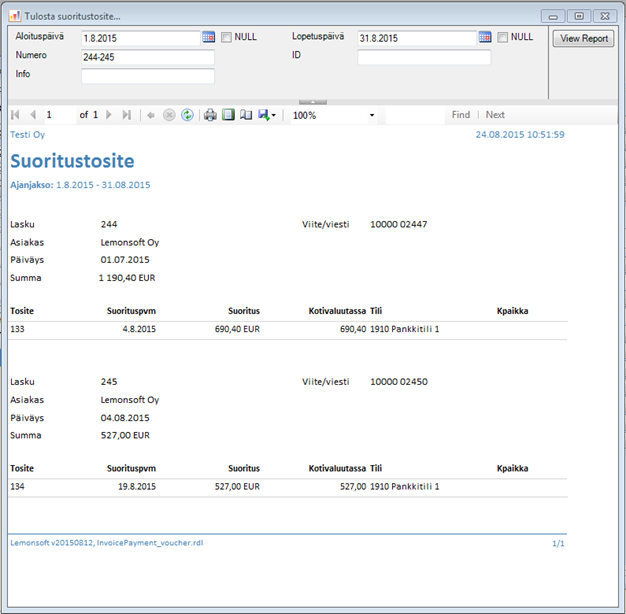 Tulosta suoritustosite -toiminnon avulla voit tulostaa haluamasi laskun suoritustositteen. Raporttia voit rajata päivämäärällä, laskunumerolla sekä suorituksen ID-numerolla. Suoritusten kirjaus -toiminto ehdottaa raporttia tulostettavaksi, kun ikkunan sulkee. Tällöin rajauksena on automaattisesti juuri kirjattujen suoritusten ID-numerot. Voit ottaa päivämäärärajaukset pois käytöstä ruksimalla NULL –valinnat aloitus- ja lopetuspäiviltä.