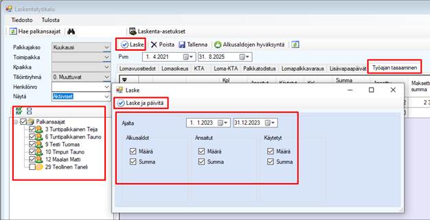 Kuva: Työajan tasaaminen -toiminnossa lasketut tiedot