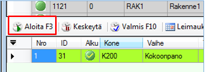 Et voi myöskään aloittaa työvaihetta, mikäli sillä ei ole aloituslupaa. Voit kuitenkin ohittaa tämän kiellon BYBASS_STARTCODE-asetuksella. Anna arvoksi 1, jolloin voit aloittaa vaiheen, vaikkei sillä aloituslupaa olisikaan.